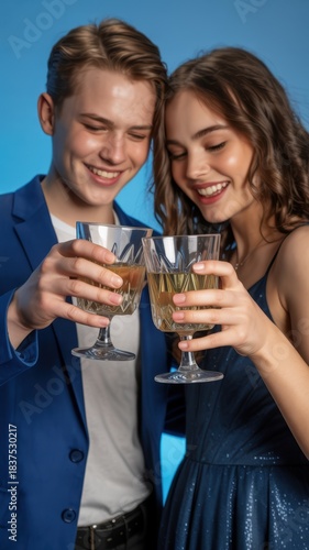 Happy teenage couple clinking crystal glasses filled with a festive drink, smiling warmly in stylish semi-formal outfits against a vibrant blue background in a minimalist New Year's celebration scene