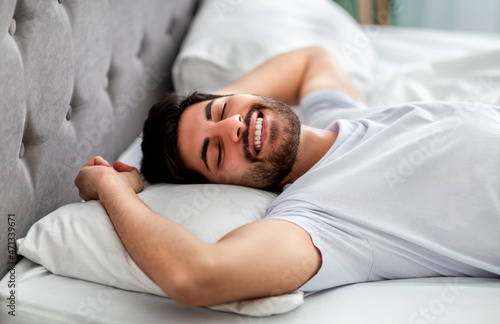 Happy wellslept arab man waking up in morning, stretching and smiling with closed eyes while lying in comfortable bed