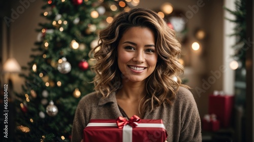 Happy Woman holding christmas gift with Christmas tree in background