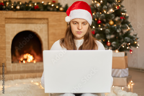 Happy woman looking in laptop in front of Christmas tree, lady wearing santa claus hat, looks at device screen, congratulating somebody via video call, posing in living room with x-mas decorations.