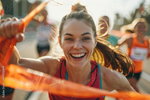 Happy woman running crossing finish line, joyful runner celebrating at sunset, athletic girl in race, winner of marathon achievement