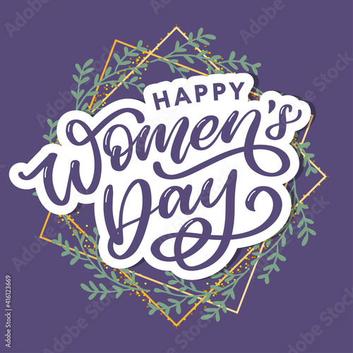 Happy Women s Day handwritten lettering. Modern vector hand drawn calligraphy with abstract flowers for your greeting card design