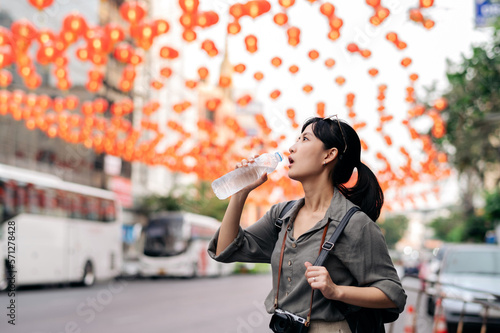 Happy young Asian woman backpack traveler drinking a cold water at China town street food market in Bangkok, Thailand. Traveler checking out side streets.