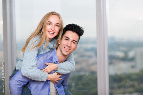 Happy young couple. Positive man and woman portrait. Hug and happy.