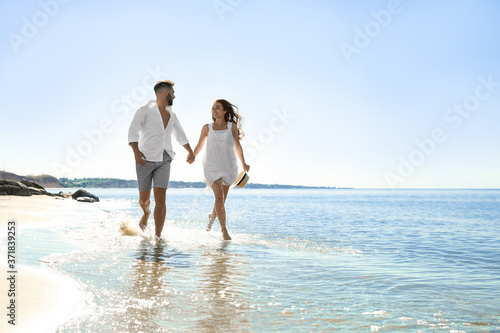 Happy young couple running on beach near sea. Honeymoon trip