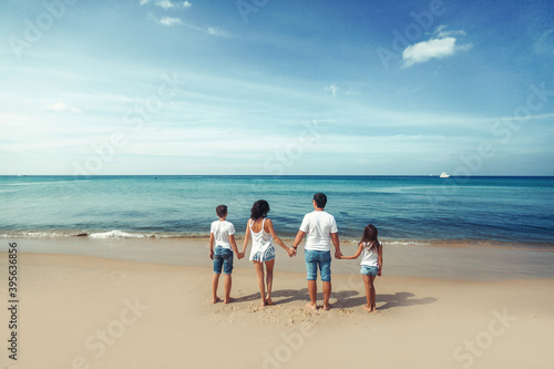 Happy young family in white t-shirts and blue jeans watching the sunset at the beach. Happy Family Lifestyle. On the background of a yacht away. Vacation. Phuket. Thailand