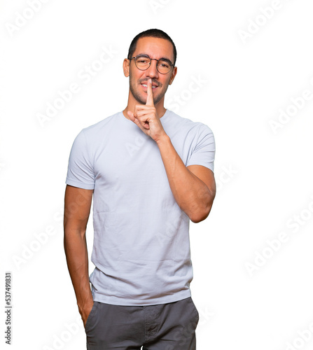 Happy young man asking for silence gesturing with his finger