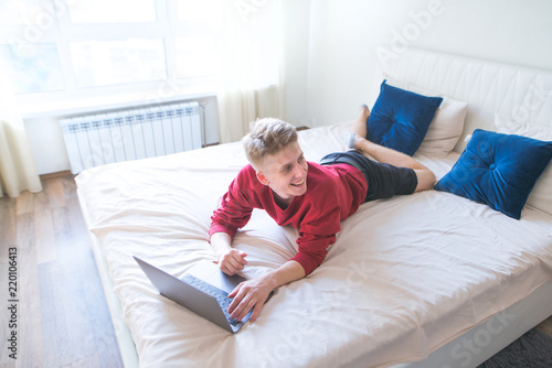 Happy young man lying in bed in a bright cozy room, using a laptop and smiling. Smiling man in a red sweatshirt is working on a laptop in bed and looking at side. Work on the Internet.