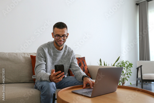 Happy young man wearing glasses looking at the screen of his phone with joy. Freelancer working on a couch in his living room. Close up, copy space, white wall background.