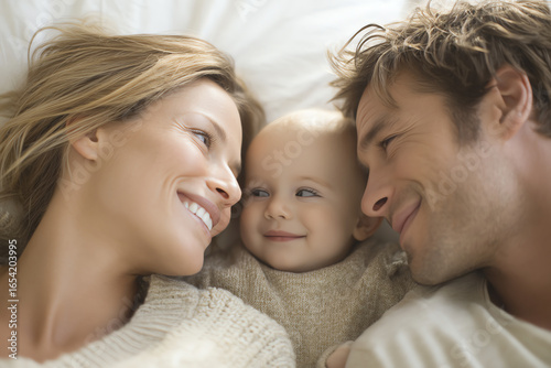 Happy young parents smiling at their baby while lying close together on a bed, sharing a tender and joyful family moment