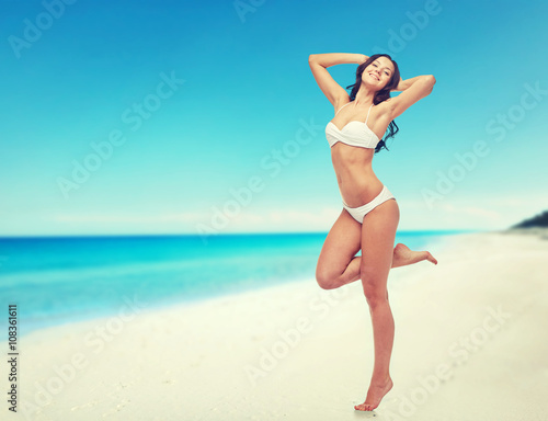 happy young woman in white bikini swimsuit