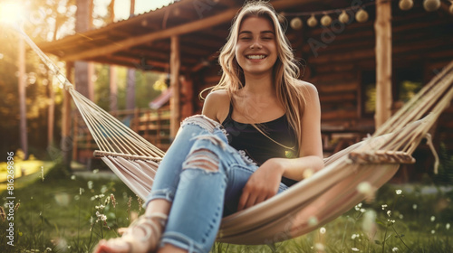 happy young woman riding on macrame swing chair near country house outdoors, cheerful female at nature in hammock