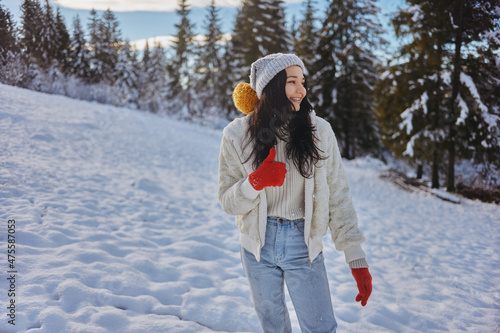 Happy young woman with a beautiful vivacious smile dressed warmly in winter clothes standing outdoors in front of forest giving thumbs up