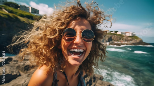 Happy young woman with curly hair and sunglasses on the beach.