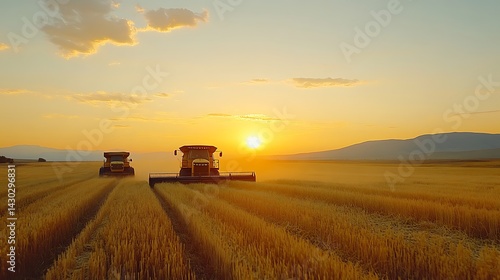 Harvesters working a golden wheat field at sunset. Possible use Stock photo for agriculture, farming, machinery, harvesting, nature