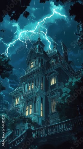 Haunted anime mansion at night, lightning illuminating the dark sky, intricate Victorian architecture, eerie atmosphere