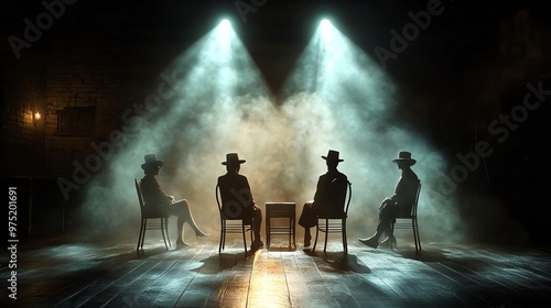 Haunted circus performers, eerie shadowy figures, 3D illustration