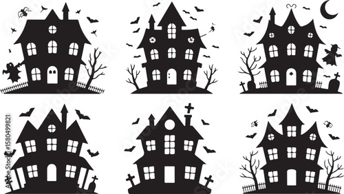 Haunted Halloween House Silhouette Spooky Haunted Mansion Vector Scary Halloween House Silhouette Creepy Haunted Castle Illustration Haunted House with Full Moon Silhouette