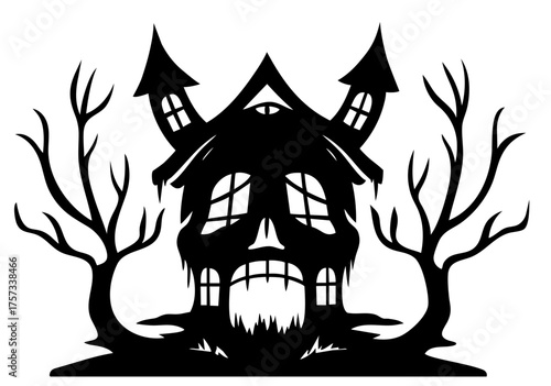 Haunted mansion shaped like skull surrounded by leafless trees, eerie shadows and dripping roof creating dark halloween atmosphere