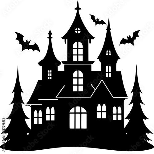 Haunted mansion with bats and trees silhouette vector illustration