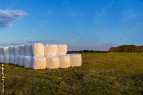 Hay balls on a field - as summer ends and autumn approach a harvest time begin in preparation for cold winter months. Agriculture and farming background. Farmer world