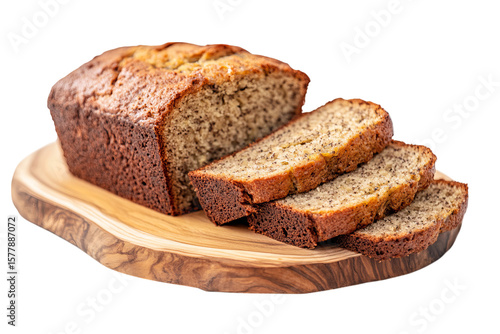 he image appears to be a high-resolution photograph of a sliced banana bread placed on a wooden board against a white isolated on a transparent background in PNG format.