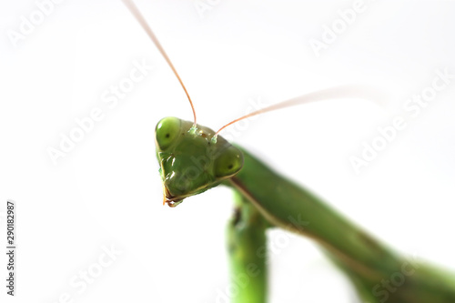 head of a green mantis on a white background.