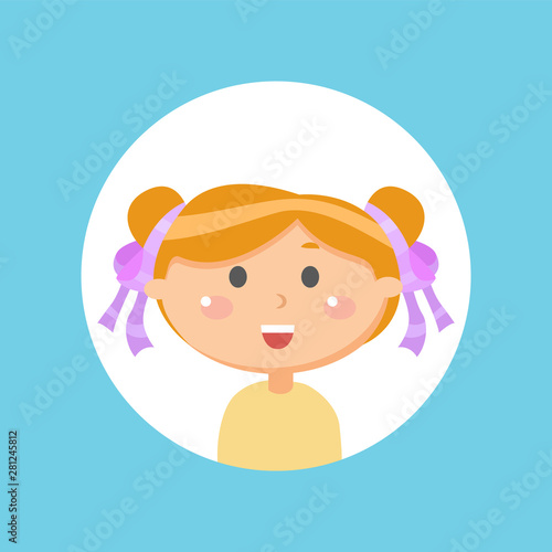 Head of smiling girl, laughing kid with ribbons on hair, smiling female character isolated on blue, child portrait view in flat design style vector