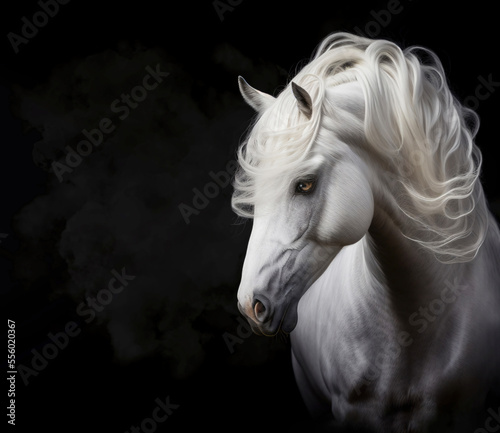 head profile closeup of long waving hair white horse stallion isolated on black background with copyspace area