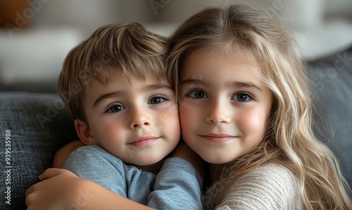 Head shot portrait of little kid girl cuddling smaller brother at home, showing love and care. Compassionate sister comforting soothing upset stressed, Generative AI