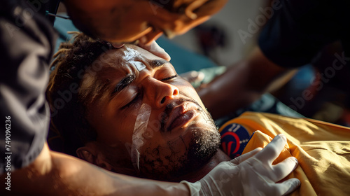 Healing Hands. Showcase the human side of disaster relief with an image of a person receiving medical attention from government aid. with a healthcare professional tending to the injured.