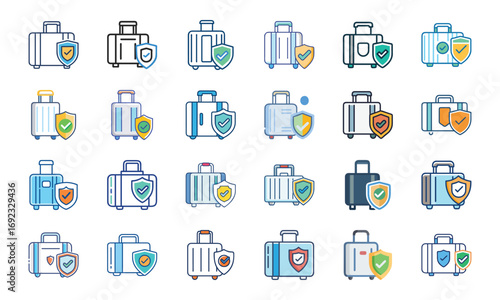 Health Insurance and Travel Safety Icons Set – Medical Protection, Car Accident Insurance, Doctor, Hospital, Vaccine, Luggage Security, Travel Coverage, Ambulance, First Aid, Health Report, Security S