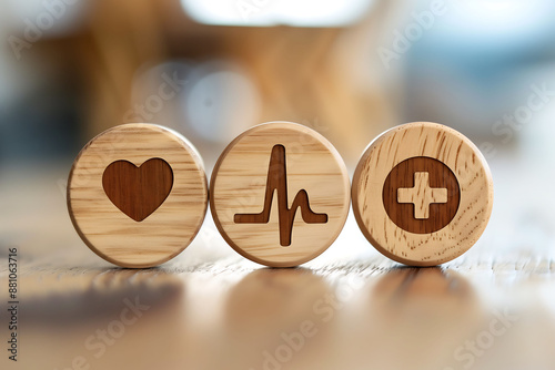 Health, medical icons and business models are the concept, 3 spherical blocks with medical plans and health care icons, Generative AI 。健康・医療アイコン・ビジネスモデルがコンセプト,ヘルスケアアイコンが描かれた3つの球体ブロック、Generative AI