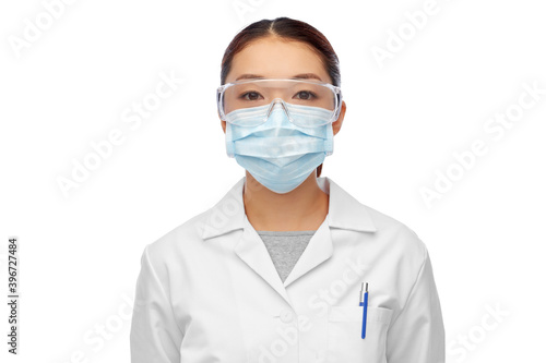 health, medicine and pandemic concept - young asian female doctor or scientist wearing goggles and face protective medical mask for protection from virus disease
