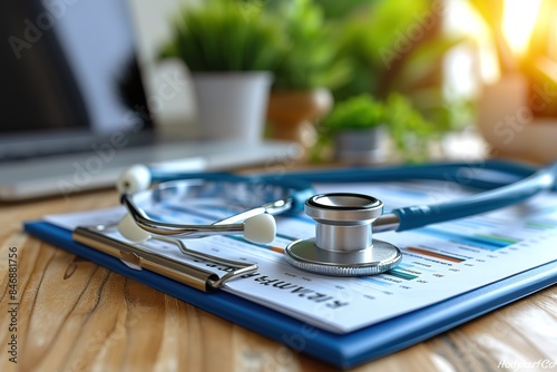 Healthcare business graph data and growth, Stethoscope with doctor's health report clipboard on table, Medical examination and doctor analyzing medical report on laptop screen