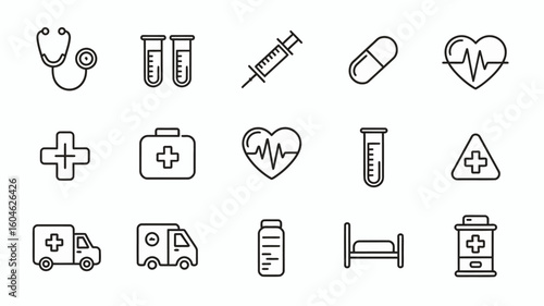 Healthcare icon collection. simple medical symbols: stethoscope, syringe, heart, doctor