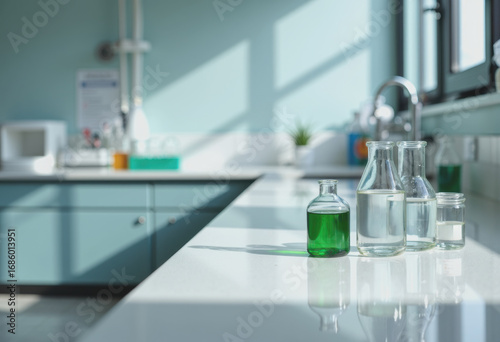 Healthcare laboratory workspace with systematically arranged equipment and glassware