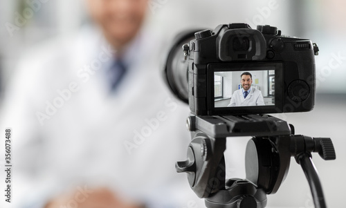 healthcare, medicine and blogging concept - happy smiling male doctor with camera recording video blog at hospital