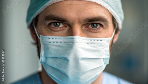 Healthcare professional wearing a mask, conveying focus and determination in a clinical setting.
