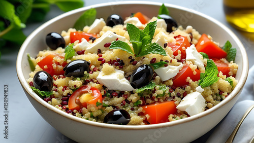 Healthy and vibrant couscous salad with feta cheese, olives, tomatoes, and fresh mint. Perfect for a light lunch or healthy meal.