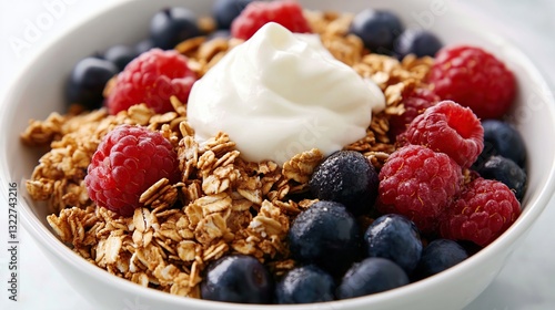 Healthy breakfast bowl of muesli with fresh berries and yogurt