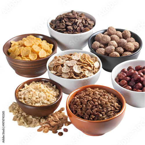Healthy Breakfast Cereal Variety Bowls of Corn Flakes Muesli Granola and More on transparent background