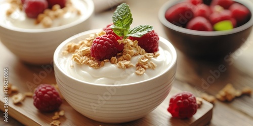 Healthy breakfast featuring yoghurt, milk, and fruit flakes creates a nutritious start to your day. This breakfast with yoghurt enhances flavor and provides essential nutrients for a balanced