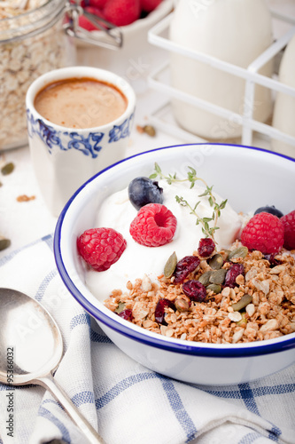 Healthy breakfast. Granola with pumpkin seeds, honey, yogurt ,fresh berries.
