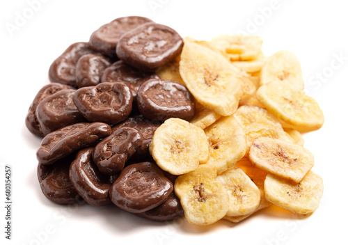 Healthy Chocolate Covered Banana Chips and Original Banana Chips Isolated on a White Background