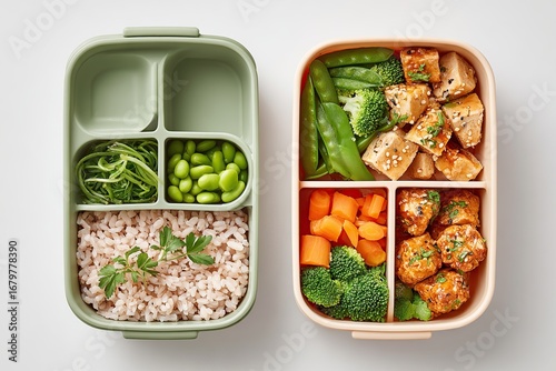 Healthy meal prep box with brown rice and vegetables