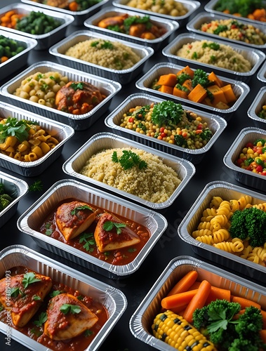 Healthy meal prep containers arranged neatly with colorful vegetables, grains, and protein dishes ideal for balanced nutrition, fitness, and clean eating habits