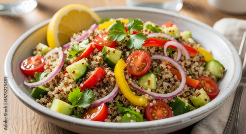 Healthy quinoa salad with fresh vegetables and lemon slice