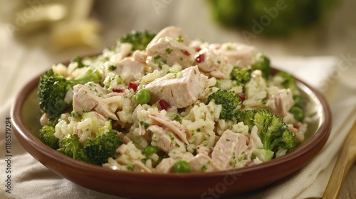 Healthy Tuna Salad with Brown Rice and Broccoli Served in a Bowl Garnished with Peas on a Wooden Table with Fresh Ingredients in Background