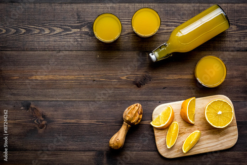 Healthy vitamin drink. Fresh orange juice near fruits and juicer on dark wooden background top view copyspace